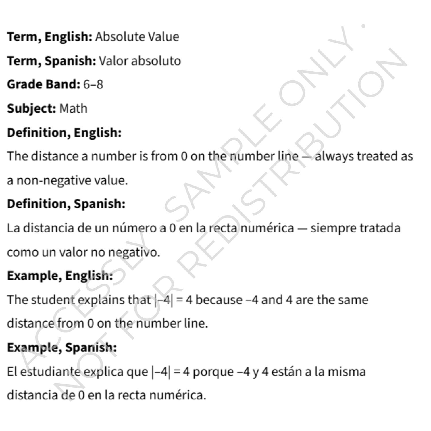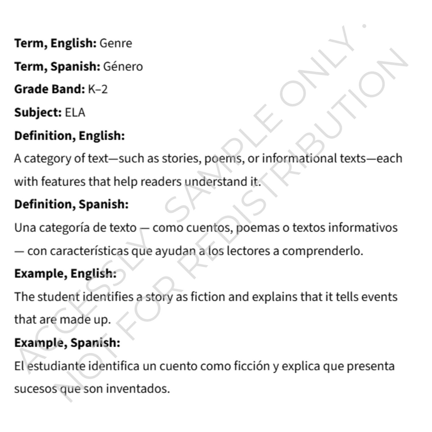 Standards-aligned academic language by grade band, so wording stays on-grade and aligned across K–12 content.Multilingual equivalents (with optional dialect support) so student- and family-facing language stays consistent.A shared terminology layer that reduces “almost right” edits across lessons, assessments, rubrics, and AI-generated content.Regular updates and quality review to keep alignment current and prevent drift over time.Coverage notes for state/framework differences, including ELL/EL label meaning where needed, so reporting stays consistent across districts.Easy-to-integrate formats (CSV, TSV, JSON, or API), with stable identifiers for versioning.