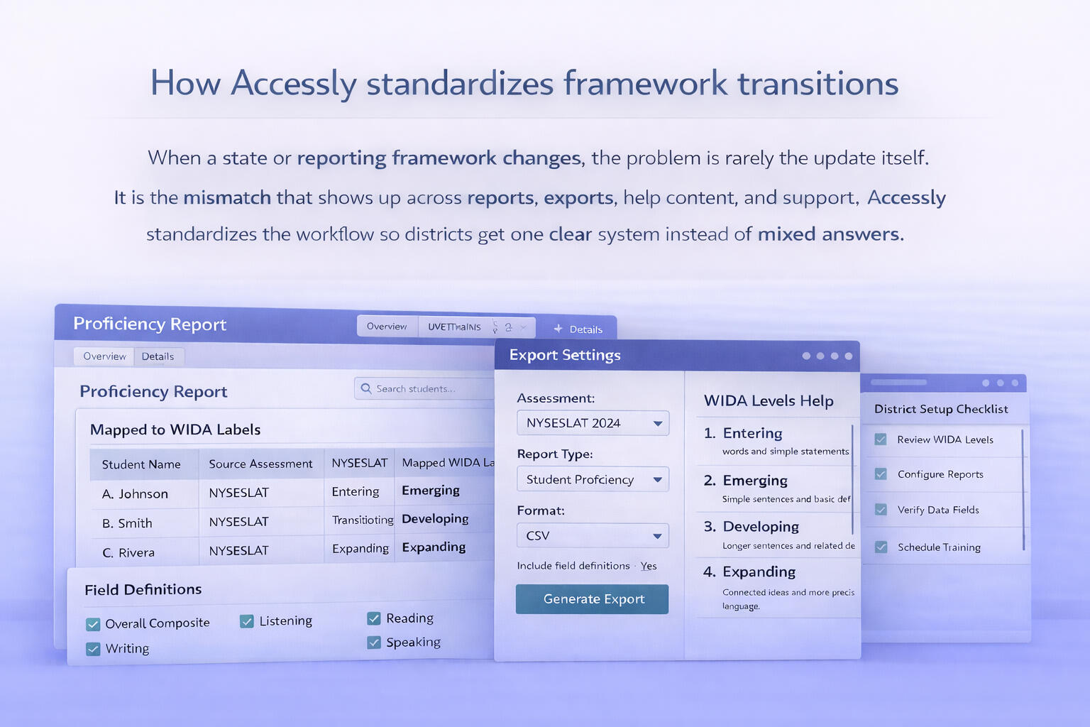 As New York moves from NYSESLAT to WIDA, the real problem is not the update itself. It is the mismatch that can show up across reports, exports, help content, and support.This case study shows how Accessly standardizes that workflow so districts get one clear system instead of mixed answers.