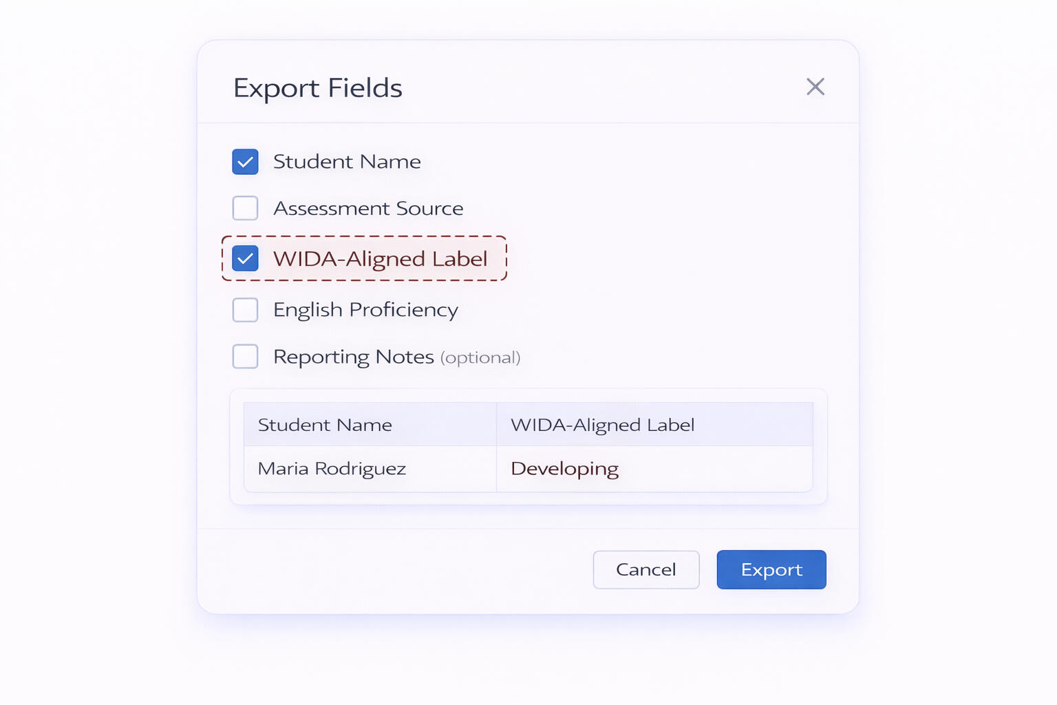 This is one reporting workflow example. The same system is used across reports, exports, help content, onboarding, and district-facing materials