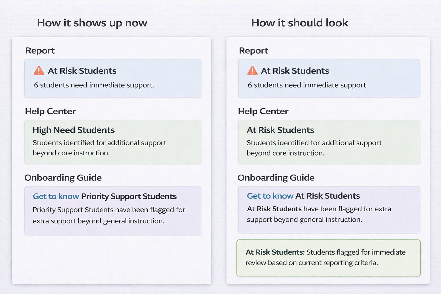 The same group of students is described differently across reports, help content, and onboarding, forcing teams to re-explain what should already be clear.