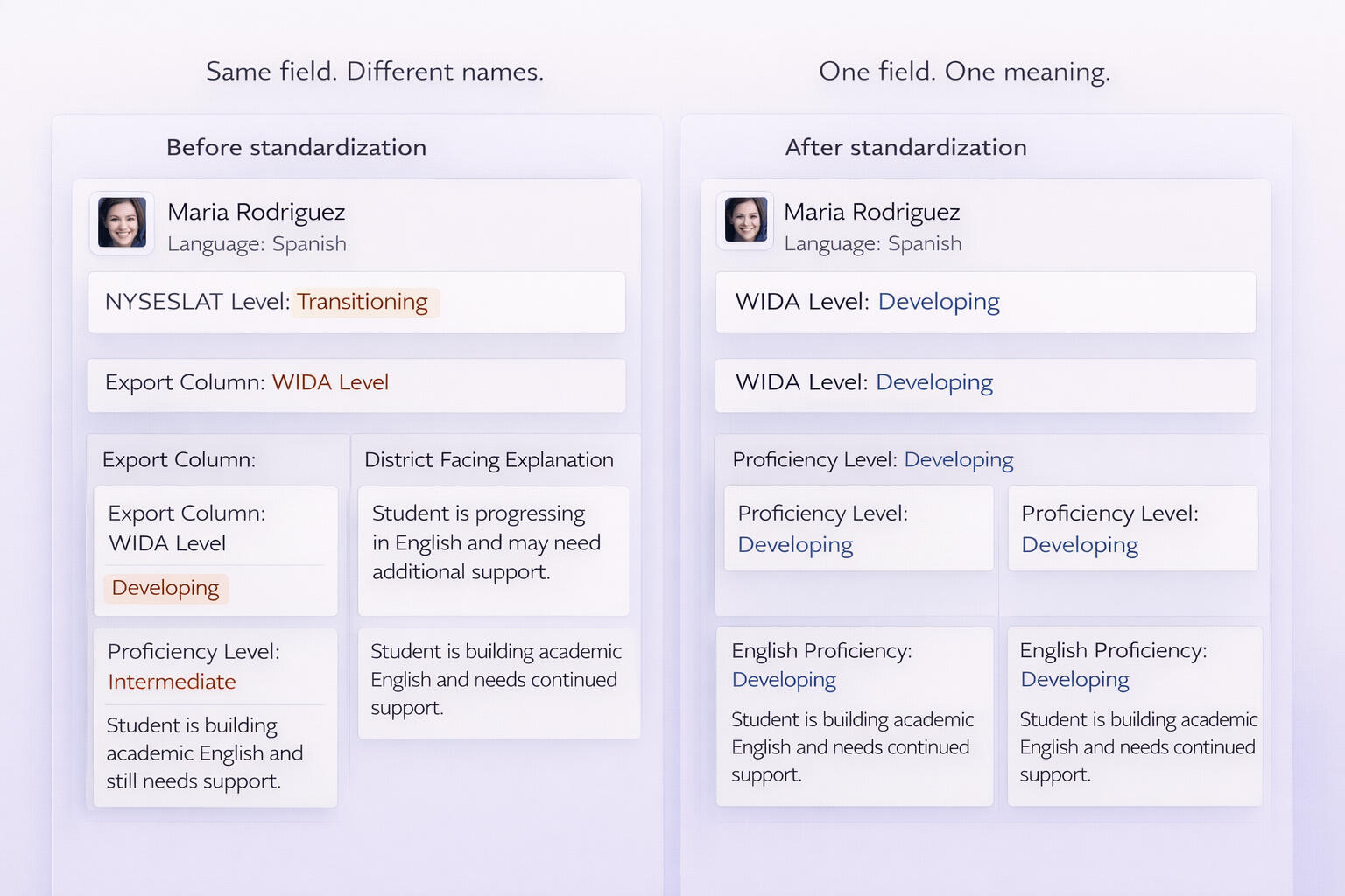 We walk through one district-facing workflow and show where the same field is being explained differently across reports, exports, help content, and support. Then we show what standardizing it would look like inside the product.